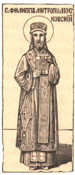 Святой Филипп, в мире Феодор, родился 11 февраля 1507 г.69 Знатность происхождения и отличия предков по службе обещали ему блистательный ход в свете. Он происходил из знаменитого рода Колычевых70. Дед его Иван Лобан Колычев пользовался доверенностью Иоанна III; он был послом при Менгли-Гирее, занимал опасные посты: то воеводы передового полка, то начальника весьма важной Ивангородской крепости; под стенами последней он сложил и голову71. Отец Феодора, Степан Иванович, старший из пяти сыновей Лобана72, был любим великим князем Василием, как «муж, исполненный ратного духа». Преданный великому князю, боярин жил в Москве, тогда как братия его жили в Новгородских имениях; но не ослеплялся «высотою сана». Он любил читать полезные книги; когда же нужно было действовать для общей пользы, был твёрд и решителен, «стропотные стези до конца стирая». Мать Феодора, Варвара, была набожна и благочестива; она и скончалась инокиней Варсонофьей. Лучшим утешением для родителей Феодора было – защитить обиженного, дать кров бесприютным, накормить и одеть нищего. Понятно, что сын таких родителей получил лучшее воспитание. Феодор учился, как и другие – по церковным книгам, и любовь к душеполезному чтению осталась в нём до гроба; другим училищем был для него храм Божий. Дворянин знатного рода готовился и на службу отчизне. К Феодору приставлены были «отроки», с тем, чтобы упражнять его в верховой езде; у них учился он стрелять в цель из пищали и из лука, ловко владеть копьём и саблей, чего требовало тогдашнее приготовление к службе. Вероятно, он участвовал в Крымском походе 1522–1524 г. и в другом 1530 г.; в первом видим дядей его, а отец его желал, чтобы сын был воином отчизны73. Великий князь Василий взял Феодора ко двору, узнав о благородных качествах души его. Юный Иоанн полюбил его. Но в малолетство Иоанна жизнь при дворе была вдвойне опасна: опасна была для жизни от интриг боярских, опасна для сердца от разврата. Молодой придворный не разделял с другими жизни рассеянной; но не был и тем, чем мог быть. То самое, что, будучи старше 25 лет, не вступал он в супружескую жизнь, показывает, что в душе его была уже мысль о другом роде жизни; но он медлил, откладывал от времени до времени; и вот Господь Сам позвал его к лучшей жизни.