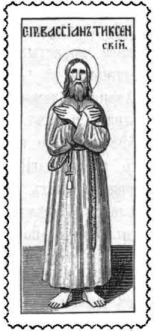 Преподобный Вассиан, в мире Василий, из с. Стрелицы, что близ Тотьмы, в мирском быту был швецом, вступал в брак и имел двух сыновей. Потом, в Тотемской обители приняв монашество, года два провел в подвигах послушания под смотрением настоятеля Ферапонта. Ревнуя же о высшем совершенстве, по благословению настоятеля, поселился в 50 верстах от Тотьмы на реке Тисне при храме св. Николая. Сперва жил он здесь на паперти храма, потом упросил причт и окрестных жителей уступить ему место в 20 саженях от храма для хижины. Ему поставили келью, и он начал уединенно подвизаться в посте и молитве. Это было в 1594 г. Он приходил в храм на каждую службу его, а в келье совершал иноческое правило. По благословению наставника своего Ферапонта, возложил он на тело свое вериги, на плечи – цепь, на чресла – железный обруч, а на голову под куколем надел железную шапку.
