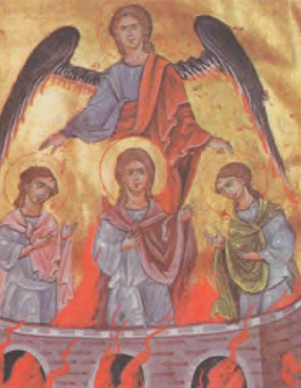 Архангел Михаил и три отрока в печи вавилонской. Книжная миниатюра. Византия. 14 век