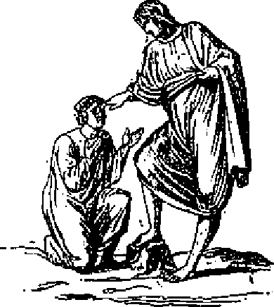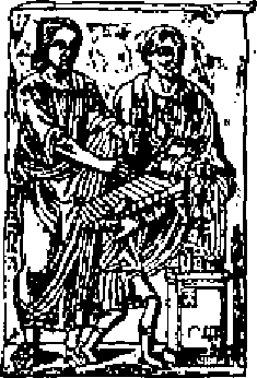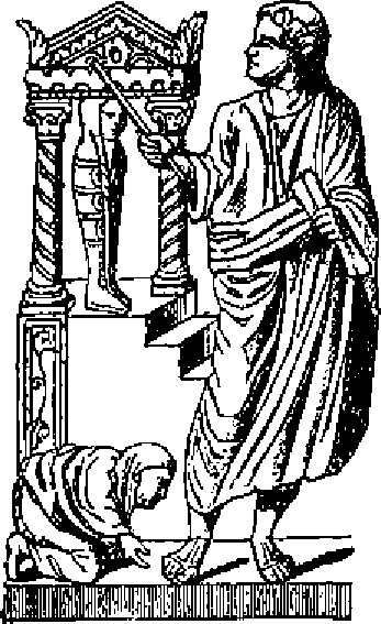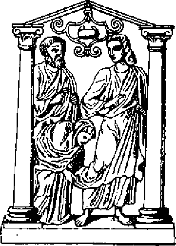Другие чины церковной иерархии встречаются также в надписях, как, например, писцы – notarii, переписчики – librarii, чтецы – lectorii, дьяконы – διάκονοι, в буквальном переводе, служители. Они названы также martyrarii, потому что им поручено было охранение гробниц мучеников. Сцена посвящения в дьяконы представлена в барельефе Arcosolium в катакомбе св. Гермеса. Этот памятник следует отнести к III столетию; тут виден мужчина, может быть, епископ, в кресле на возвышении, в которому ведут пять ступенек; он одет в тунику, украшенную на груди двумя пурпуровыми полосами – clavi – и pallium, наброшенный на правое плечо; в левой руке его распущенный свиток пергамента, а правую он простирает таким образом, что она приходится над головою, стоящего перед ним юноши с поднятыми руками, в положении молящегося, и одетого в далматику, с подобными же полосами. Двое других молодых людей, без бороды, также, в тунике и pallium, каждый со свертком пергамента в руке; несколько старше и выше ростом, юноши представлены по обеим сторонам его. Вероятно, это посвящение в духовный сан, погребенного в этом arcosolium, верующего; оно должно напоминать главное событие его жизни, и есть продолжение обыкновения, очень распространенного в мире классическом, представлять самое значительное происшествие существования умершего на его гробнице, как это свидетельствуют сюжеты многих саркофагов.