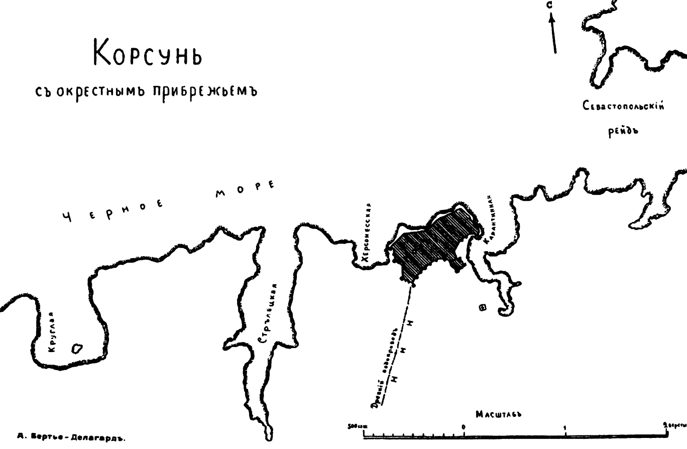 Осада подвигалась вяло. И вот некий «мужь именемь Анастасъ корсунянинъ» написал на стреле, где искать под землей городской водопровод. Он был обнаружен еще А. Бертье-Делагардом, который подтвердил этим достоверность летописного рассказа.654 У ученого были некоторые сомнения относительно того, что в летописи правильно передан текст сообщения: «Кладези, яже суть за тобою отъ въстока, ис того вода идеть по трубѣ, копавше, переимите воду». В ЖВ, где рассказ о ходе осады тоже выписан из летописи, сообщение Анастаса звучит иначе: «Кладези отъ восточный стороны града въ градь по трубамъ сведени». Видеть здесь указание на расположение главной цистерны (объемом около 1500 м3) вряд ли можно. Дело в том, что Бертье-Делагард помещал лагерь Владимира в Карантинную бухту. Если он был в Стрелецкой, то линия водопровода действительно была к востоку от него (см. карту), на что и указал Анастас.