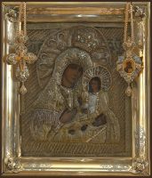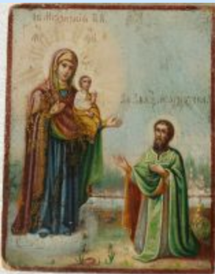 3) Икона, именуемая Ополченная. Так названа икона потому, что, когда во время войны в 1812 году составлялось народное ополчение, она была дана от обители местному ополчению, молившемуся пред чудотворной иконой, в залог заступления Богоматерью. По окончании войны она была возвращена в обитель с украшениями. Икона была в рядах ополченцев и в 1856 году.