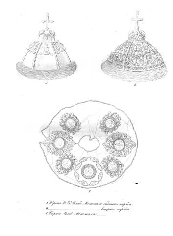 Чужестранные путешественники в XVI веке, описывают нам великолепие Государских утварей, из которых многие утрачены в смутное время России, когда Царские сокровища сделались добычею Поляков.928 При Царе Михаиле Феодоровиче в 1641 г. было пять шапок Царских. Теперь древнейшею из корон почитается так называемая929.