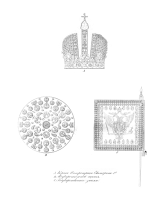 3) Сделанная к коронации Императрицы Екатерины корона в 1724 году отличается от древних Царских венцов своею Фигурой, сходною с Европейскими Императорскими коронами. Ее возлагал на себя при короновании Петр II в 1728 году, Февраля 25. По образцу ее сделана новая для коронования Императрицы Анны Иоанновны. От прежней короны остался один только серебряный остов, с коего сняты алмазы. В первой 2536 алмазов, 4 крупные яхонта, 17 лалов, 5 шпинаров, 1 винис и 1 хрусталь-смазень; под алмазным крестом на верху значительной величины и цены лал Водокшанский.