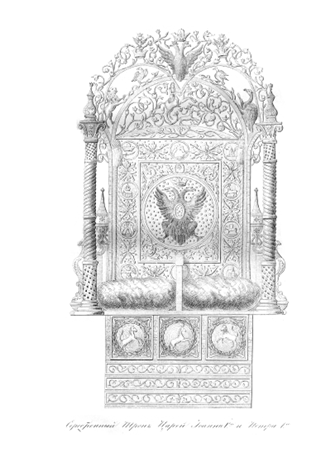 Из Государских тронов, 1. древнейший, присваиваемый преданием Великому Князю Иоанну III; он выдается за присланный ему из Греции, по случаю бракосочетания его с Греческою Царевной Софиею Фоминичной. Кресла сии обложены слоновою костью, на коей вырезаны рельефом происшествие из истории Царя Давида и Самсона, осада какого то города, со стен коего стреляют из пушек, сцены охоты, разные арабески. На спинке сих кресел изображен двуглавый орел под тремя коронами, окруженный львом и единорогом. 2. Украшенные бирюзами и лалами креслы присланы Царю Борису Годунову в 1605 году от Персидского Шаха Аббаса. 3. Кресла Царя Алексия Михайловича, поднесенные ему в 1659 году от Испаганской Армянской компании; на спинке их вышитые золотом и серебром по черному бархату два Ангела с трубами держат корону над следующею надписью: Potentissimo et invictissimo Moskovitarum Imperatori Alexio, in terris faeliciter regnanti, hic tronus, summa arte et industria fabrefactus, sit futuri in coelis et peremnis faustum faelixque omen, anno Xristi 1659.943 На верху перететивы, литой из серебра, двуглавый орел под тремя коронами; а по сторонам его изображение Св. Апостола Петра с ключом в руке и Св. Николая чудотворца с Евангелием. По алмазным украшениям сей трон слывет алмазным и выносится в Успенский собор по случаю Высочайшего коронования Государя Императора. 4. Кресла, убранные бирюзами, бериллами, лалами и жемчугом, по ярлыку на них, Царя Михаила Феодоровича, а по работе их, должны быть XVI века; они выносятся в Успенский собор во время коронования, для Государыни Императрицы.
