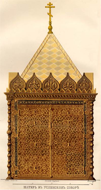 Над престолом сень шатровая на четырех столбах медных, литых, лощатых с яблоками; с четырех сторон в три ряда теремки украшают пирамидальный верх шатра. Между столбов были четыре спуска серебряные резные, замененные ныне бархатными, а на них стояли по углам Ангелы с рипидами, в средине же были Евангелисты сидящие, чеканенные из серебра; вместо их, ныне вышиты по бархату золотом Ангелы. Над ними была следующая надпись накладными серебряными словами: «Божию милостию, по благословению и по повелению великого Господина Святейшего Патриарха Кир Филарета Московского и всея России, при державе благоверного и благородного, Богом венчанного и Христолюбиваго Великого Государя, Царя и Великого Князя Михаила Феодоровича всея России Самодержца, Владимирского, Московского, Новгородского, Царя Казанского, Царя Астраханского и многих государств Государя и обладателя, при его Государевой благочестивой и Христолюбивой Царице и Великой Княгине Евдокии, при их благородной дщери и Благоверной Царевне и Великой Княжне Ирине Михайловне, в 15 лето государства, в 8 лето Патриаршества, по плотскому рождению Великого Государя Царя и Великого Князя Михаила Феодоровича всея России, отца его и по духовному чину отца его и богомольца, Господина Патриарха Филарета Московского, сделан был сей киот на престол Господа Бога и Спаса нашего Иисуса Христа, домовою казною, в соборную церковь Пресвятые Владычицы нашея Богородицы и Приснодевы Марии, честного и Славного Успение, во олтаре 7135 года, месяца Августа в 15 день». К стенам алтаря этот шатер прикреплен железными цепями.