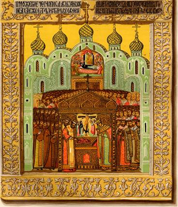 k) Над дверьми в приделе Св. Апостол Петра и Павла стоит образ Успения Божией Матери, который в праздничные дни полагается на налой для чествование. В Треодионе 1668 г. он назван Согбенным356. По преданию357, он писан на гробовой дске Св. Алексия Митрополита358.