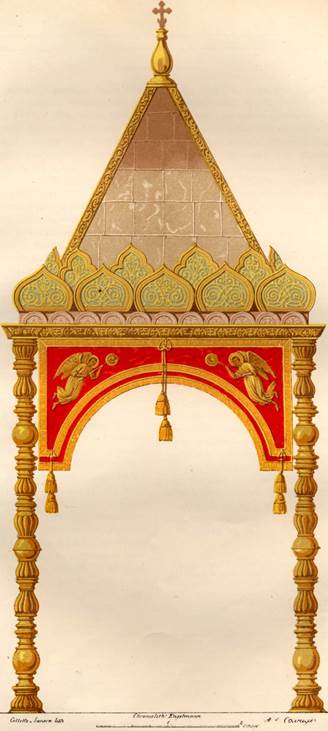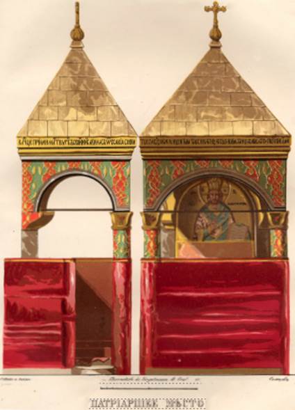 Горнее место Святительское, каменное, нишею, или раковиною углублено в стене; к нему ведут три ступени. По обе стороны его на стенах десять образов четвертных в киотах; по видимому, они напоминают нам десять Патриархов, которых мощи, при отпевании, во время совершения литургии, пред чтением Евангелия, вносили в алтарь и ставили на горнем месте367. Между сими иконами, вероятно, келейными Святителей, находится еще образ Спасителя, указующий перстом на слова Евангелия Св. Иоанна. Академик Кеппен, признавая оный за произведение кисти Императора Мануила в XII веке, почитает его за образец, с коего писаны были в последствии большие образа в Новгородском и Софийском соборах под именем Корсунских. Но икона сия так записана зоографами нашими, что не обнаруживает никаких следов семивековой древности своей; При том место, на коем стоял в Софийском соборе Мануилов образ, есть место великих, а не малых икон и верный там ее список есть великая, а не малая икона.