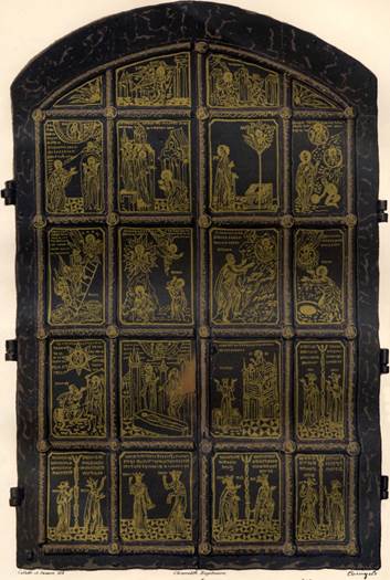 IMP. CÆS. FL. CONSTANTINO MAXIMO. P. P. AVGVSTO. S. P. Q. R. QVOD INSTINCTV DIVINITATIS. MENTIS MAGNITVDINE CVM EXERCITV SVO TAM DE TIRANNO, QVAM DE OMNI FACTIONE VNO TEMPORE JVSTIS REMPVBLICAM VLTVS EST ARMIS, ARCUM TRIVMPHIS INSIGNEM DICAVIT, т. e». Императору, Цезарю, Флавию Константину Великому, отцу отечества, Августу, Сенат и народ Римский посвятили сии триумфальные врата за то, что, по внушению свыше, и по своему веледушию, он освободил праведным оружием государство от тирана и его скопища»364. По преданию, сохраненному описями собора, сей барельеф привезен из Рима; а по надписи, снятой с Константиновых ворот в Риме, скорее можно почесть изображение ратоборца за Константина Великого, освободившего церковь Христианскую от гонения язычников, чем за Св. Георгия; ибо Евсевий упоминает о поставленном на сих вратах изваянии Цесаря с копием в руках и с надписью, из коей значится, что Рим освобожден от тирана знамением спасительного креста365. Западная церковь, не редко смешивая историческое с иносказательным, под видом поражения дракона изображала истребление язычества, а под ликом девы избавленную от гонений Церковь или вечный град Рим. По сходству сего подвига Константина с чудом современного ему Св. Георгия, спасшего Финикийскую Царевну от дракона, в барельефе принимали одно современное лицо за другое и соединяли аллегорическое изображение с историческим; ибо имя всадника не означено. Как сие древнее изваяние известно было более под именем Св. Георгия и согласно с преданием: то оно и приписано сему победоносцу, занявшему место в гербе Российском. – Стиль памятника, показывающий упадок ваяния, принадлежит к средним векам; всадник в окрыленном шлеме на голове, в досчатой броне с приволокою на раменах, с набедренниками и наколенниками, с острогами на полусапожках; он сидит на седле и в стременах, из коих первые сделались известными с Константина Великого, а последние со времени первого нашествия Франков. В древней Вивлиофике, ч. X, значится, что «в 1721 году, Декабря 20, по словесному приказу Синодальных Архиереев Новгородского Феодосия и Псковского Феофана, образ Георгия Великомученика, что стоял на «гробе Феогноста Митрополита, спрятан в ризницу». При поновлении Успенского собора пред коронацией Императрицы Елисаветы Петровны в 1742 г. оный образ был покрыт красками и поставлен на прежнее место.