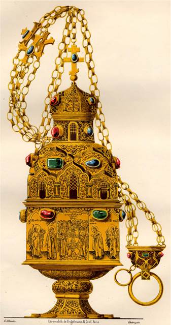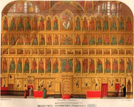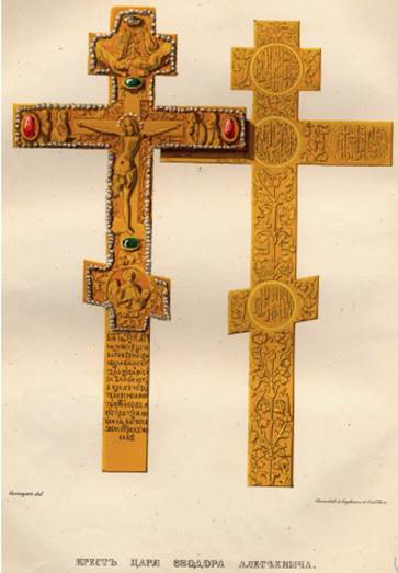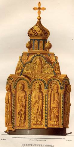 После пожара, потребившего в 1547 г. почти все Кремлевские здания и разрушившего кровлю и паперти Успенского собора, Царь Иоанн Васильевич 1550 г. возобновил его, покрыл верхи его вызолоченными медными листами и переложил из прежней серебряной раки в новую золотую св. мощи Петра Митрополита, стоявшие, во время переделки, в Чудове монастыре314. Памятники покорения и присоединения к Московскому Государству Владимира на Клязьме, Новгорода Великого, Пскова, Устюга Великого и Смоленска – св. иконы, взятые из сих городов и поставленные на поклоне в иконостасе, который выражает мысль единодержавия, образовавшегося в Москве из системы Уделов. Из сокровищ Новгородских и Псковских часть посвящена была Иоаннами III и IV и Василием III на украшение первопрестольной церкви.