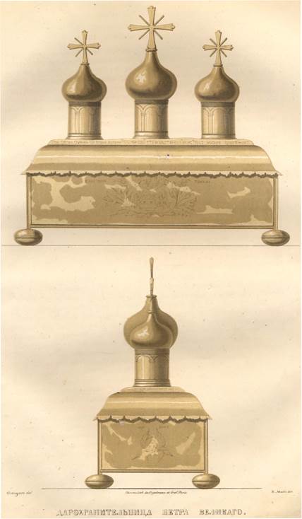 Св. Петр, первый Митрополит в Москве, в 1325 г. перенес свою Митрополию из Владимира Кляземского в Москву, где и окончил жизнь свою, и, как мы сказали, погребен в храме, им сооруженном, 1326 г. Декабря 21. Тохтамыш раскрыл гроб его, «чающе нечто сокровенно»330. При новом построении Успенского собора 1471 года, св. мощи Петра были положены в новую раку. Церковь наша празднует 24 Августа вторичное перенесение мощей его при третьем сооружении собора 1479 года. В Святцах, напечатанных в Москве 1648 г., под 4 числом Августа показано: «Проявление мощей иже во святых отца нашего Петра Митрополита Московского»; при чем замечено следующее: «Святитель Петр Митрополит явися благочестивой Царице Анастасии, не повелевая никому же гроб свой раскрывати никогда, и повел ей своею печатью раку свою запечатлети, и того дня уставаши праздник сей праздновати». Но в новейших Святцах не включено сего праздника. Св. мощи Петра, лишенные Поляко-Литовцами драгоценной раки, положены были под спудом, в новую деревянную, окованную серебром; из Патриаршего устава видно, что на праздник Святителя Петра 1679–84 г. приносили в Успенский собор мощи его, т.е. часть оных, сверху от Патриарха и клали их то на налой, то на гробницу Святителя331. До 1812 году они лежали под спудом запечатанные и запертые; Наполеон расторгнул гробницу св. храмоздателя, вероятно, с таким же святотатственным умыслом, как и Тохтамыш. С дозволения Св. Синода, Преосвященный Августин торжественно открыл св. мощи Петра Митрополита при освящении первой придельной церкви Успенского собора, где они опочивают. Над гробницею Святителя, вновь обложенною серебром, сделана сень.