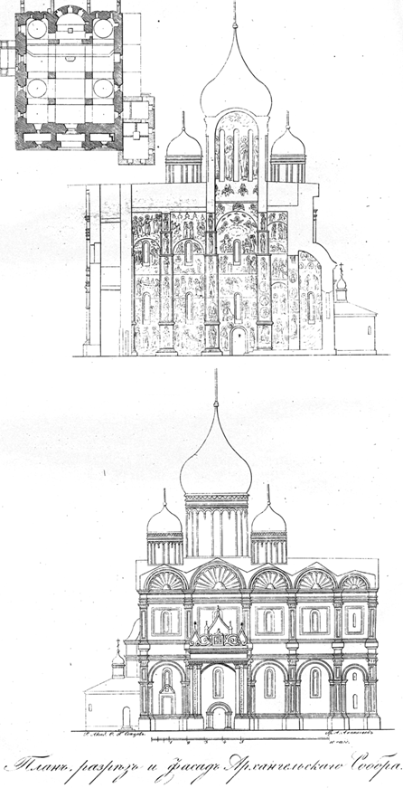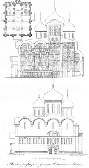 Через 146 лет, за ветхостью и теснотою, этот собор был разобран до основания и заложен новый Великим Князем Иоанном III, при Митрополите Всероссийском Филиппе I, который для построения его сильно обложил данью все монастыри и церкви; Бояре и гости добровольно пожертвовали часть своего имения на церковное создание308. До окончания оного поставлена была на месте алтаря деревянная церковь, к коей приградили гроб Святителя Петра. Мастера Иван Кривцов и Мышкин взялись строить этот храм шире и длиннее Владимирского полутора саженями; но, не разумея силы в том деле, жидко растворяли известь с песком неклеевито, а внутрь стены сыпали мелкие камни и поливали известковым раствором; от того – замечает летописец – «не крепко дело, яко же тягиня того камениа погнетет вместо и правило стены извихляется»309. Собор, складенный уже до сводов, обрушился 1474 г. По недостатку искусных в России мастеров, Иоанн вызвал из Венеции славного зодчего Фиоравенти, которого «хитрости ради зваху Аристотелем». По воле Великого Князя, этот художник осматривал во Владимире тамошнюю соборную церковь, которая послужила образцом для Московского собора. Разрушив до основания уцелевшие от падения стены оного, Фиоравенти выкопал новые рвы глубиною в две сажени и более, заложил величественный и по тому времени единственный храм, ознаменованный печатью стиля Византийского, смешенного с Ломбардским. В стенах и столбах, где прежде клались дубовые брусья, он положил железные связи; а своды свел в один кирпич, однако так, что сквозь их бывала течь от дождя; на четырех круглых столбах утвердил своды храма, алтарные же на двух четвероугольных, складенных из кирпича; около шеи большой главы он устроил казну и лестницу на верх церкви, а четыре верха покрыл по дереву Немецким железом, выписанным вместе с мастерами из Новгорода310. Помост сделал он из мелкого камня; в алтаре над Митрополичьим местом изваял было из камня Латинский крест (Ляцкий крыж), который в последствии уничтожен был, по приказанию Митрополита Геронтия.