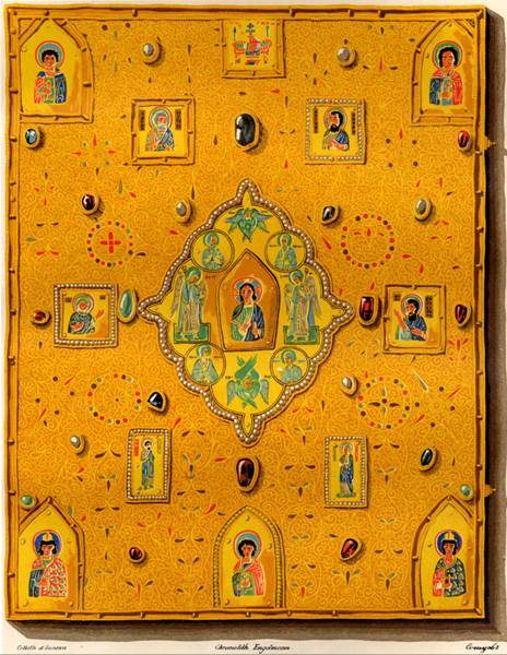а) Всемилостивого Спаса, сидящего на престоле, с разгнутым в левой руке Евангелием, на словах Св. Евангелиста Иоанна из II зачала: Ἐγώ εἰμι τὸ φῶς τοῦ κόσμου; десницею указывает он долу. Такое указание объясняется чудом от сего образа, писанного Императором Греческим Мануилом, который изобразил Спасителя, указующим десницею на слова Евангелия. Но когда Мануил, восхитив суд Святительский, нещадно наказал одного Иерея: тогда Спаситель, явившийся ему в сонном видении, велел ангелам возложить раны на Царя, который, по пробуждении своем, ощутил язвы на теле своем и увидел на иконе перст, указующий долу346. Сия местная икона Греческого стиля, стоящая по правую сторону царских врат, слывет еще золотою рясою, потому что обложена была золотом, и Корсунской, потому что она, как гласит предание, взята из Корсуня, или писана Корсунским пошибом. Из Софийского собора она перенесена была в Москву 1476 г. Великим Князем Иоанном Васильевичем, как священный трофей покорения Новгорода, где в соборе оставлен точный снимок с той иконы347