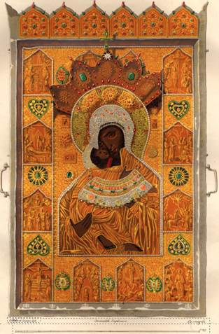 2) Владимирской Божией Матери, письма Симона Митрополита, верный снимок с подлинника, известный под именем запасного обложен басменным золотом, с негранеными каменьями в гнездах.