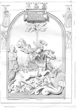 4)363 Барельеф на белом тесаном камне, известный под именем образа Св. Георгия, поражающего копием дракона крылатого. Доска имеет вид усеченного эллипсиса, шириною 13 вершков и 2/8 толщиною 6/8 вышиною 1 аршин и 4 ½ вершка. Она вставлена в деревянные рамы, на коих написаны Св. Князья Борис и Глеб, Св. Прокопий и Иоанн Устюжские. Над главою всадника, осененного лавровым деревом, на дощечке вырезана вглубь следующая надпись по линейкам: