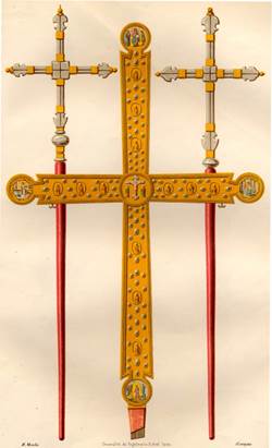 За престолом между вышеупомянутыми Корсунскими иконами стоят Корсунские кресты, два из горнего хрусталя, один окованный серебром с пятью финифтяными образами, из коих четыре древней, а пятый – новой работы.