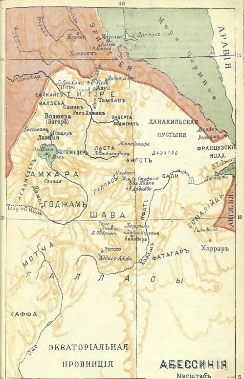 1. Физические условия. При взгляде на карту Африки бросается в глаза противоположность южной узкой части и северной. Первая – высокое плоскогорие, вторая – б. ч. низменная; звено между ними – Нил и вдающаяся длинная коса высот между ним и Чермным морем. Между 18°– 6° ш. и 35°– 40° в. д. (Гринв.) эта коса переходит в высокую горную страну, называемую по имени своего главного народа Абиссинским плоскогорием. На севере оно примыкает к Чермному морю между областью Суакина и бухтой Зула (древ. Адулис), на юге почти доходит до области великих озер, на востоке спускается к Данакильской пустыне, к западу круто обрывается. Таким образом оно выделяется подобно острову из окружающих стран и походит на высокий замок, укрепленный природой. По мнению специалистов (Цандера, Федорова) оно вулканического происхождения и вулканическим переворотам обязано своею разорванностью. Вся страна изрезана глубокими долинами, перерезана горными цепями и расчленена течениями рек. На севере р. Мареб отделяет плато Хамасен; между ней и горами по ту сторону Такацы лежит область Тигре; далее к югу – Амхара и Годжам, отделяемые Голубым Нилом и горами от самой южной области Шавы (Шоа). каждая из этих областей делится на множество более мелких: Шире, Зальдеба, Сараве. Агаме, Вагара, Самен (самая высокая с вершиной Рас-Даджан в 14409 ф.), Тамбен, Эндерта, Ласта, Вожерат, Бегемедер, Ангот, Дамот, Фогара и др. Каждая из этих областей заключает в себе группу высоких многогранных призм, разделенных пропастями. Эти столы («амба») иногда обширны и помещают целые города, иногда это – просто столбы в несколько сот метров вышины, на которых находят приют монастыри, замки, тюрьмы и т. п. – Кроме Голубого Нила, берущего здесь начало и протекающего чрез оз. Цана или Дембея, лежащее среди котловины на высоте 7000 фут., его притоков Хаваша, Мареба, Такацы и Барака, средствами орошения служат многие другие реки, речки и озера (Хайк на востоке), а также периодические дожди (с конца июня по октябрь). Но реки здесь не служат в то же время средствами сообщения, а еще более разъединяют области; это трудно проходимые рвы с удушливой атмосферой, приносящие в бурное время огромные камни, которые запирают дороги и задерживают караваны. Климат этих долин («куалла») тропический; здесь растут баобабы, смоковницы, оливки, мимозы, имбирь, коркорум (пряное растение). Огромные леса и прекрасные луга дают приют слонам, носорогам, бегемотам, буйволам, антилопам, ядовитым змеям. На высоте 4800 ф. куалла переходит в более умеренный пояс «страна винограда» (оajna daga), где при 11°–21° кроме винограда растут фруктовые деревья и кофейные кусты, хлебные растения (пшеница, сорго, теф, элевзина, роды гороха и бобов), произрастает хвойный лес, дающий притон различным породам обезьян, зверям кошачьей породы, гиенам, шакалам. Наконец местности выше 9000 ф. называются «дага»; здесь при 7°–10° (ночью иногда ниже 0°) растут чибарра, листогонное куссо и ячмень. Население группируется в средней полосе с ее близким к европейскому благорастворенным климатом. Почва везде отличается необыкновенным плодородием; красоты природы имеют немного себе равных в мире. Влияние этих физических условий на судьбу страны очевидно. Разорванность ее и в вертикальном, и в горизонтальном направлении обусловила государственную разобщенность, междоусобия. Плодородие, не 
