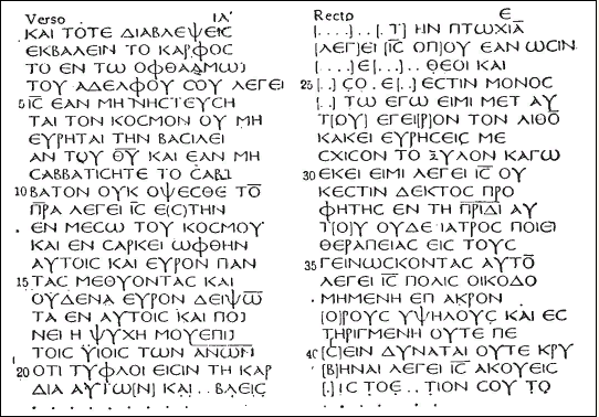 Новооткрытый памятник найден был при начале самых раскопок в куче мусора, в которой оказалось вообще много греческих папирусов от I–III веков нашей эры. По особенностям письма, он относится к этому именно времени, так как буквы имеют форму позднейших еллинистических унциалов. Но так как найденный лист представляет собою остаток книги, а не фрагмент папирусного свитка, и так как, далее, в нем встречаются употребительные в христианских рукописях сокращения, как IС, ФС и др., то издатели справедливо отнесли этот памятник ко второй половине II века. Что касается внешности памятника, то он имеет 5 3/4 дюйма в вышину и 3 3/4 в ширину. По краям лист весьма истрепан, самая поверхность его до крайности изношена и имеет много разрывов и дыр, затрудняющих его чтение. Позднейшей рукой на оборотной стороне листа (vеrso) над правым углом текста поставлена греческая цифра IА, указывающая очевидно на то, что это 11-й лист из целой книги. Самый способ письма носит на себе архаический характер: строки идут сплошными рядами без всяких словоотделений или других каких-либо облегчающих чтение способов. Лист содержит по 21 уцелевших строки на каждой странице, а 22 строка на обеих страницах совершенно разрушена. В них содержится семь или восемь изречений Иисуса Христа, из которых каждое начинается знаменательным введением – Λέγει Ἰησοῦς – «Говорит Иисус», что и дало издателям право назвать весь этот памятник – Δόγια Ισοῦ᾿ – «Изречения Иисуса».