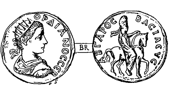 Авгарь, царь Осроенский, современник римского императора Гордиана III (238–244 г.). На левой стороне медали изображен импер. Гордиан с его надписью ΟΡΔΙΑΝΟС СЕВ, а на правой Авгарь на коне с надписью一 ΑΒΓΑРОС ВАСІΛЕVС=Авгарь царь.