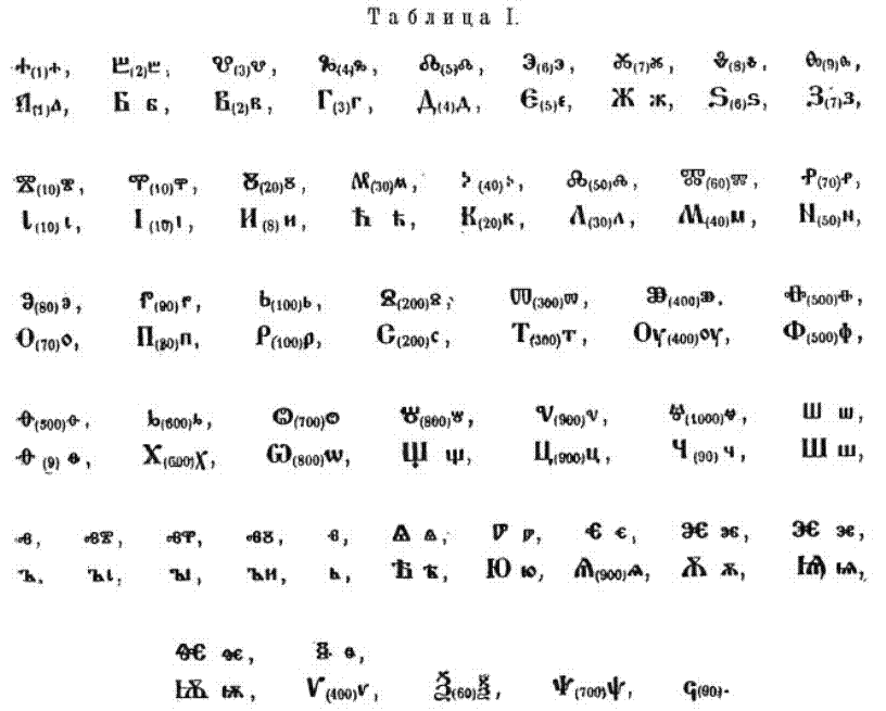 Буквы кирилловской азбуки, точно так же, как и буквы греческие, кроме звукового, имеют еще числовое значение, то есть употребляются как цифры. Кириллица здесь следует рабски за своим греческим оригиналом, и в ней только буквы греческого происхождения, в порядке греческой азбуки, означают числа: а 1, б 2, г 3, д 4, е 5, ӡ 7, и 8, д 9, ɪ 10 и так далее, а новые буквы для славянских звуков (кроме ѧ 900 на месте сходной с ним греческой сампи) остаются без числового значения. При этом для обозначения 6 употребляется греческая стигма, (потомок древней дигаммы), а для обозначения 90 – греческая коппа (см. на таблицу II две последние буквы), из которых потом стигма, заменив собою древнейшие формы буквы зело, приняла на себя также звуковое значение этой последней, а коппа с течением времени была заменена сходной с нею буквой – ч.