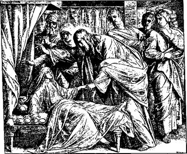 Но Господь, выслав всех из дома, оставил только отца и мать девочки и трех учеников Своих, Петра, Иакова и Иоанна, и вошел в комнату, где лежала на постели умершая.