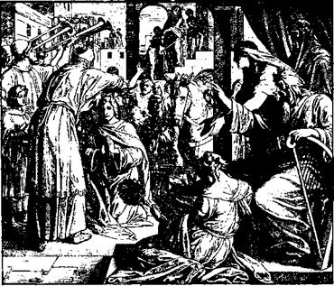 Царь велел помазать Соломона на царство. Соломона посадили на мула царя Давида и повели мула к потоку Гиону близ Иерусалима. Священник взял рог с елеем и помазал Соломона на царство.