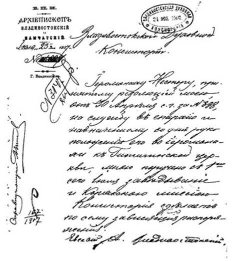 16 октября 1916 года по милости Божией совершилось посвящение меня в сан епископа Петропавловского, второго викария Владивостокского и Камчатского епископа с пребыванием в г. Петропавловске.