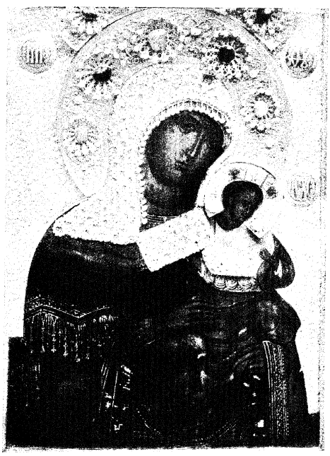 В 1773 году икона была коронована венцами, присланными от папы Климента XIV. Икона принадлежит к той большой серии греко-итальянских православных икон Б. М., которые в XV веке перешли с Балканского полуострова через южную Россию (вовсе не из Польши) в Вильну (Остробрамская), Минск, Гродно, Жировицы и пр. Как известно54, этою иконою благословил в 1559 году греческий митрополит Неофит, проезжая из Москвы на Волынь, помещицу Гойскую. Икона эта, имеющая в вышину 6 ¼ верш. и 5 ⅛ в ширину, представляет Б. М., склонившуюся к Младенцу головою. Богомладенец, положив левую руку на плечо Матери, правою благословляет. По сторонам иконы, на раме, имеется семь миниатюрных изображений свв. угодников: пророка Илии, пм. Стефана и свв. Нины и Авраамия; по низу погрудные изображения Великомученицы Екатерины и преподобных Параскевы и Ирины.