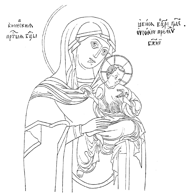 Не имея хорошего рисунка с оригинала чудотворной иконы, предлагаем, кроме небольшего (рис. 17) снимка с него, также копию списка иконы Коневской, имеющегося в ризнице Троице-Сергиевой Лавры за № 3. Список этот ХVI столетия (рис. 18 (12х9); Б. М. облачена в малиновый хитон, а Младенец в светло-белую рубашку с крапинами итало-критской иконописи. Икона № 52 Русского Музея, вывезенная из Москвы Арсением Елассонским и данная (по надписи) в Хиландар, совершенно записана афонскими греками, о чем см. Η. П. Лихачева Обозрение хр. древностей в Музее Имп. А. III, 1902, стр. 22.