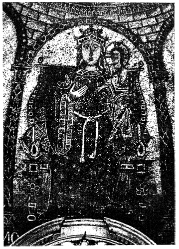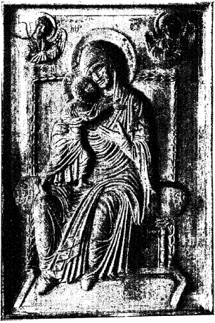 По поводу этой надписи высказывалось соображение, что как самый памятник был, по всей вероятности, привезен из Константинополя после 1204 года, так и надпись, по всей вероятности, называет какого-либо Михаила из византийских императоров, так как барельеф, по этим догадкам, должен был украшать какую-либо Константинопольскую площадь, а на площади, будто бы, никто не мог ставить памятников, кроме императора. На самом деле, все соображения эти совершенно произвольны и, как мы надеемся впоследствии показать, среди барельефов ц. св. Марка не мало собственно венецианских изделий, а также, кроме константинопольских, добычи из всяких других местностей востока. Поэтому, кто был этот Михаил – судить мы в настоящее время не можем, но и утверждать того, что это был император, между тем, как в надписи этого совсем не указано, не имеем основания, так как обычай для этого был, несомненно, совсем иной44. Рельеф этот больших размеров, с фигурой Б. М. почти в натуральную величину, представляет ее сидящею на престоле и обнимающею Младенца, Который, стоя на ее правом колене и бросившись к ней, охватил ее шею. Обнявши Младенца правой рукою, Мать в трогательном умилении прижала левую руку к груди, как бы стараясь подавить в себе начавшееся скорбное волнение. Таким образом, настоящая композиция представляет один из наиболее любопытных по своему лиризму византийских типов Богородицы, воспроизведенный несколькими русскими иконами. В поле иконы наверху, в рельефе, изображены по грудь два ангела, а с боку читается вырезанная с краю надпись: ἡ ἀνίκητος. Что может значить этот украшающий эпитет «Непобедимой» Богородицы мы не можем сказать, пока особым расследованием не будет выяснено, какой местности Византии принадлежала икона этого имени.