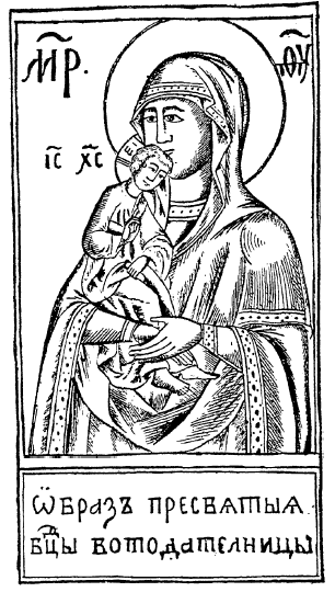 Между нашими иконами, воспроизводящими разбираемый тип, наибольшую важность имеют: Муромская и Цареградская. Список первой иконы 1765 года фряжского письма представляет рис. 63.