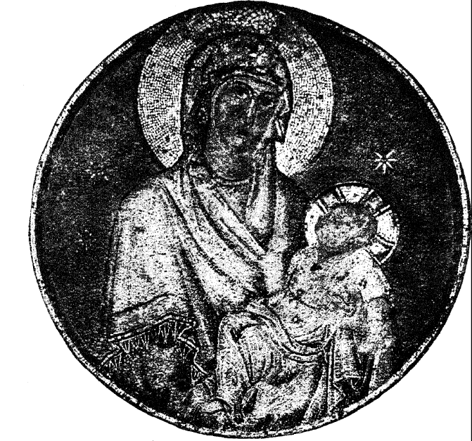 Византийская иконография Б. М. выработала всего семь основных типов20: на первом месте: 1) тип Одигитрии, в различных переводах (первоначально Б. М., стоящей с Младенцем на левой руке, затем сидящей, с тем же положением Младенца, вариант с Младенцем на правой руке и т. п.); 2) тип общий и древне-христианскому и романскому искусству представляет Б. М. держащую Младенца перед собою на коленях и известен в России под именем «Печерской»; 3) известный тип «Оранты»; 4) «Знамения» (Великой Панагии) – тип Оранты с медальоном Младенца или самим Младенцем по грудь на груди Матери; 5) Б. М. Деисусной; 6) Б. М., сидящей на престоле без Младенца и держащей руки, приподнятыми перед собою (тип Заступницы Небесной) и, наконец, 7) тип, который пока будем условно называть «Никейским» по тамошней мозаике21 или «Никопейским», по чудотворному образу Венеции, и который изображает Б. М., стоящую и держащую Младенца обеими руками перед собою. Этого рода типы исчерпывают иконографию Б. М. во всех монументальных произведениях византийского искусства, но затем они же повторяются в миниатюрах и даже на монетах. Конечно, эти типы не исключают вариантов, возникающих в результате известных композиций, например, увенчивания Б. М. Царя и Царицы, обращения Богородицы к молебщику или ктитору и т. под. Возможно, впрочем, что на иных мелких вещах: эмалевых образках, вислых печатях (когда будут изданы и те и другие и точных снимках), будут открыты иные варианты и даже иные тины, как, например, указываемый ниже тип Б. М. с полулежащим Младенцем на руках, на афонской панагии. Издатель византийских вислых печатей академик Шлюмбергер22, делая обобщение типов Б. М., встречающихся на печатях, насчитывает всего также 7 или 8 типов и при этом те же самые, которые мы перечислили выше. Однако, в его перечне соединяются, во-первых, тип «Оранты» и «Знамения» (Панагии), а равно тип «Одигитрии» представляется в вариантах.
