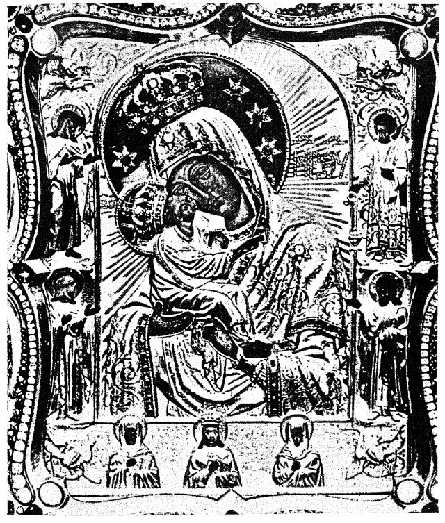 Б. М. представлена совершенно спокойною, но поддерживающей Младенца обеими руками. Положение ее рук указывает на близость иконы к первоначальному итальянскому списку, сохранявшему натуральность принятой позы. Младенец резко обернулся налево к кому-то, кто с левой стороны к Нему подходит; Он представлен почти отроком десятилетним. Письмо иконы правильное и смелое, но не особенно «плавкое». Но главный интерес иконе придает на этот раз ее оклад, орнаментированный в известном пошибе византийского стиля, с примесью восточных форм, которая вообще отличает собою орнаментацию Балканского полуострова. Здесь наблюдается некоторый варварский характер, как в рисунке выпуклых щитков, так особенно в чеканных изображениях человеческих фигур, и, наконец, и в самых декоративных темах. Так, например, на нимбе Б. М. в кружках изображены три эмблемы евангелистов: Матфей представляется архангелом, с мерилом в руках; Иоанн – крылатым орлом, а Марк – двуглавым орлом, держащим две скрижали, или две таблетки. В нимбе Младенца надпись имени Иисуса Христа выполнена в арабском шрифте, что указывает на XIV век и наводнение Балканских земель исламом. По каймам оклада изображены князь и епископ, а при них, исполненные чернью, вырезаны монограммы. Монограммы дают имя Николая-епископа. Епископ этого имени считается в ряду охридских архиепископов тринадцатым по-принятому счету и был управителем епархии при Стефане Душане, а в то же время последним архиепископом Охриды. Как мы уже говорили, по указанию академика Е. Е. Голубинского60, в середине XIV столетия охридская архиепископия была под властью сербов, хотя удержала греческий характер. Весьма возможно, что недостающие монограммы намеренно выцарапаны болгарами, прочитавшими в них имя сербского краля, быть может, именно Стефана Душана. Изображенный с левой стороны на окладе князь, в коротком кафтане и мантии и полукруглой княжеской шапочке, украшенной камнями, держит здесь развернутую грамоту или свиток, а одну руку поднял в знак объявления своей воли или дара61.