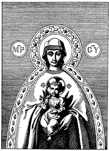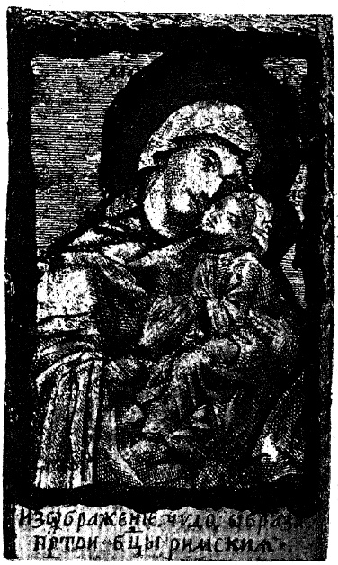 13. Особый художественный тип «Умиления» представляется простейшим (рис. 106 и 107) переводом итало-критской иконы95, представляющей Богоматерь скорбно и любовно склонившейся к Младенцу, а Его прильнувшего к Ней щечкой и вложившего ручку в ее свободную правую руку, в то время как левая поддерживает и слегка приподнимает Младенца. Тип этот воспроизводится изображениями чудотворной иконы «Римской» (что тоже – Лиддской) Богоматери, как видно по старинной гравюре, здесь представляемой96 (рис. 108).