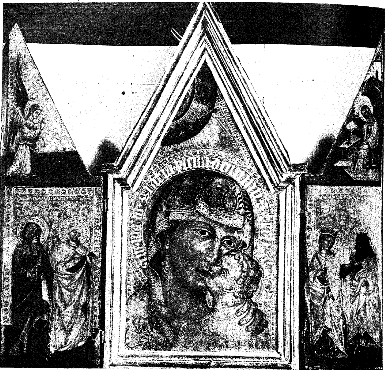 Путем одного наглядного примера попробуем разъяснить, в чем именно заключалась та внутренняя жизнь, которая была сообщена итальянскою живописью иконографии Богородицы и которая привлекла к себе с такою силою греческую иконопись, что заставила ее изменить прежнему гиератическому пошибу и ввести в свою среду целый ряд интимно-лирических типов Б. М. Избираемый пример представляет икона Петра Лоренцетти (рис. 96) в нижней церкви св. Франциска в Ассизи в поперечном нефе с левой стороны. Икона эта имеет форму продолговатой погребальной плиты, с группою Б. М. и Младенца посредине и св. Франциском и Иоанном Богословом. Под этой иконой представлены Распятие, два фамильных герба и умерший в позе молящагося Мадонне. Главным достоинством группы Б. М. с Младенцем (рис. 97) признается их необыкновенная выразительность: оба они ведут живой разговор друг с другом, и Мадонна, большим пальцем указывает на св. Франциска. Однако, большинство историков искусства92 не объясняет темы этого разговора и, очевидно, не заинтересовано действительным смыслом экспрессии в их лицах. Между тем, как легко можно видеть по судорожному движению губ и всего лица Б. М. и напряженному взгляду Младенца и Его порывистому движению, речь идет о стигматах Франциска: прижимая левую руку к груди, святой обнаруживает знак добровольно принятой им страстной любви к Спасителю, крестной Его раны. Вот из каких драматических тем возникли подобные иконописные сюжеты, как например, «Умиление» вообще, икона «Страстной» Б. М. и им подобные.