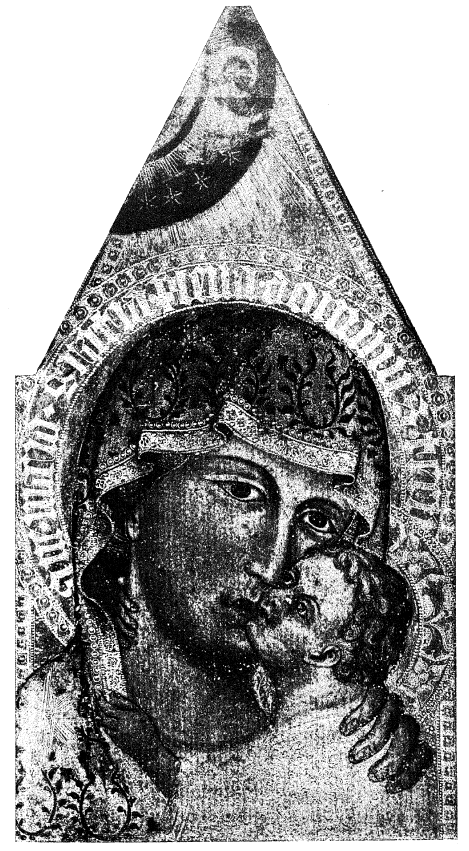 Во Флоренции, в церкви св. Марии Маджиоре, в боковой капелле налево небольшая икона Божьей Матери XIII-XIV века (рис. 111), чуть подновленная в красках лика, является этою копиею, любопытной по отношению к образованию особого типа «Умиления» известного под именем «Корсунской» Б. М.97.