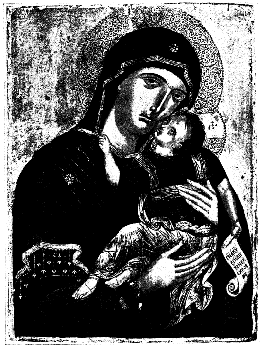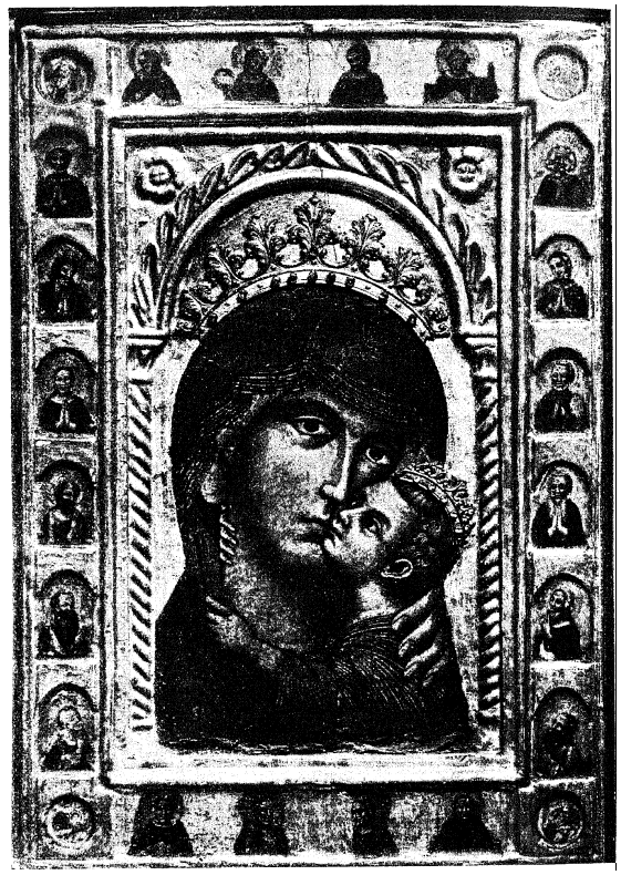 12. После икон «Страстной» Б. М. в греке итальянской иконописи следует ряд икон Б.М. «Умиления» («Материалы» Н. П. Лихачева, №№ 66–83). Исконное происхождение типа «Умиления», по всем данным византийское, и установка его относится к ХI-ХII столетиям; по-видимому, само название «Умиления» является переводом имени Б. М. «Элеусы» – Милостивой. Исследование древнейших типов Умиления показывает, что они так или иначе воспроизводят в XII-XIII стол. образ подобный чудотворной иконе «Владимирской» Б. М. в Успенском соборе, что подтверждается медными образками именно той эпохи, находимыми в развалинах древнейших киевских храмов.
