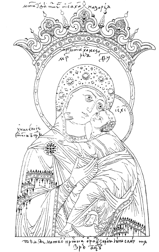 При отсутствии точных снимков с наших чудотворных икон, пока не представляется никакой возможности установить в наших типах «Умиления» редакции и варианты и приходится ограничиться единственно указанием на подходящие иконы этого имени. Прежде всего, должно сказать, что тип «Умиления» в нашей иконописи сближен был с Владимирской иконой Б. М., хранящейся в Московском Успенском соборе, которой древность, удостоверенная преданием, а затем и фактом перенесения в Москву в 1395 году, делает эту икону, как бы источником и прототипом высокого образа. Наглядное свидетельство тому представляем, во 1-х, в снимке Владимирской иконы (рис. 119), (уменьшенном с одного из больших снимков, исполненных для Иконописного Комитета), и, во 2-х, прорисью, (рис. 120), на которой перевод подобный Владимирской иконе назван «Умилением». Древняя икона «Умиления» в Псково-Печерском монастыре, хорошего снимка которой нам не удалось получить, является тоже списком типа Владимирской иконы. Такова же отчасти чудотворная Б. М. «Оранская», почитаемая в Оранском монастыре Нижегородской епархии и в свое время заказанная, как точный список с Владимирской иконы Успенского собора, что было в 1629 году. Однако же, по снимку иконы, в ней сохранена только композиция Владимирской иконы и вовсе не соблюден ее тип. Позднейшими вариантами и списками представляются также чудотворная икона Владимирской Б. М. в «Мироносицкой» пустыни Б. М.104 и «Волоколамская», явившаяся в 1677 году. С Владимирской иконы исполнены были копии уже в древности, например, в Новгороде икона 1548 года105. Прославленные списки Владимирской иконы находятся также в Ростове, Флорищевой пустыни.