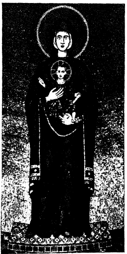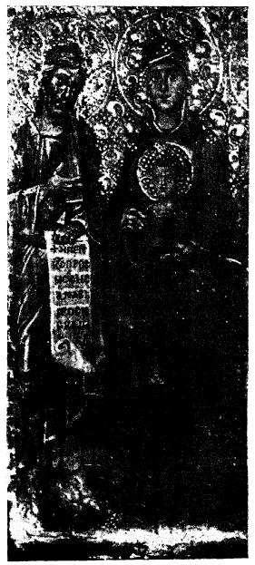 Среди разнообразных типов Богоматери, выдвинувшихся около X столетия, мы встречаем один, представляющий некоторые загадочные стороны по своему происхождению. Этот тип представляется прежде всего мозаическим изображением в абсиде церкви Успения в древней Никее110. Среди золотого фона, покрывающего сплошь свод алтарной ниши этого храма, на высоком подножии изображена стоящею Богоматерь, которая держит Младенца обеими руками, как бы слегка прижимая Его к своей груди левою рукою у колена, а правою у плеча в то время, как Младенец правой рукой благословляет перед собою. Поверх идет крупная надпись из псалма 109, 3: «Из чрева прежде Денницы родих Тя». Богоматерь представлена здесь в самом обычном облачении мафория, окаймленного бахромою темно-пурпурного цвета и в темном пурпурном же хитоне с золотыми наручами и белым ручником в левой руке Богоматери. Мозаика очень любопытна по стилю, но пока плохо издана, и очень любопытна в иконографическом отношении, но, конечно, не дает оснований думать, будто композиция данного в ней типа возникает только в результате продолжительного процесса возвеличения Богоматери в искусстве. Было бы противно истинной истории утверждать, что византийский тип Богоматери восходил от натурального изображения все далее и выше к церковному догматическому представлению: от Матери, держащей Младенца у себя на руках, к аллегорическому представлению церкви, молящейся за мир Предвечному Сыну, к торжественному изображению Богоматери, держащей перед собою Младенца сидя на великолепном троне. Исторический анализ, с достаточной ясностью устанавливает, что подобного хода развития типа Богородицы на самом деле не было, а в данном случае мы решительно должны отвергать какую бы то ни было переходную связь между композициею Кипрской-Печерской Б. М. и оригинальной фигурой Никейской мозаики. Если Никейская мозаика и представляет собою развитие какого-либо предыдущего типа, то, по всей вероятности, этот тип сложился сам по себе на мелких вещах, как например, на складных крестах тельниках. Если, далее, и будет когда-либо возможным привлекать сюда также и мелкие изображения монет и вислых печатей, несмотря на их неясные рисунки, то остается невозможным предлагать такой материал для какого бы то ни было утверждения.