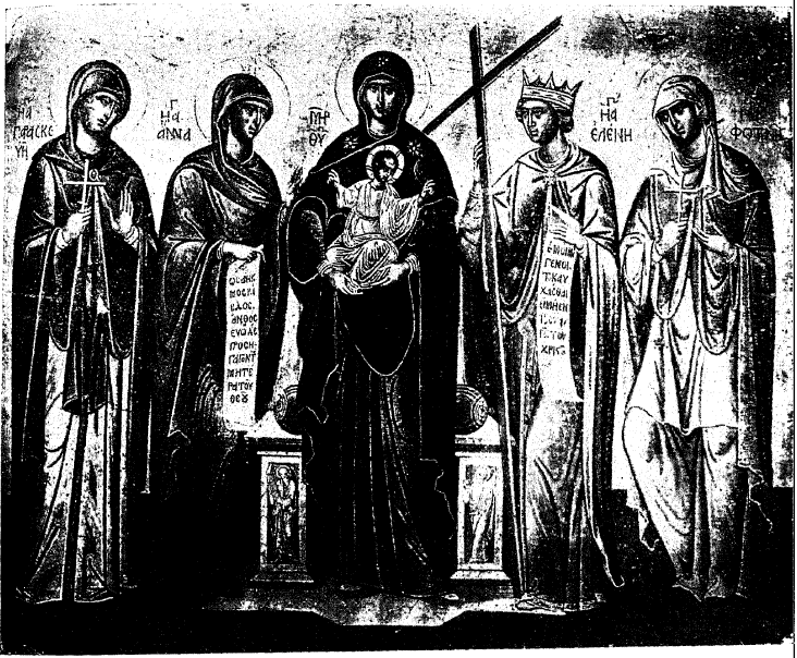 Затем мы находим, несомненно, тот же тип во фресках Карейского Протата (рис. 145), а также в иконе Б. М. «Милосердие» (покрывающей людей мантиею), работы мастера Христофора (грека) Болонского, 1380 г.116).