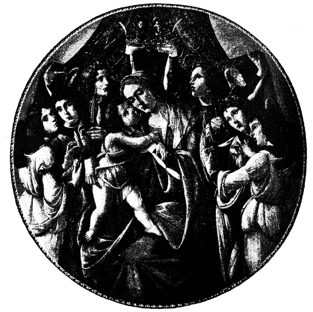 Основным внутренним мотивом как разнообразных типов Умиления Б. М. и всех композиций, к нему примыкающих (порывистое движение Младенца к Матери, взаимные их объятия), так и в особенности, типа Б. М. «Страстной» и ему родственных, служит тихая сдержанная скорбь Б. М. при мысли о Его мученической человеческой судьбе. Как известно, наиболее ярким выразителем этого мотива в итальянской живописи является Боттичелли (1446–1510). Не касаясь ни свойств его таланта, ни различных сторон его художественной деятельности, заметим, что именно преобладанию этого мотива в образах Мадонны у Боттичелли (таких образов насчитывается до 20 сохранившихся; число же выполненных художником несравненно больше) должно быть приписано некоторое тяжелое страдальческое настроение иных его картин. Правда, с другой стороны, тому же мотиву скорби Мадонны и умиленных ласк Младенца обязаны его картины необыкновенный трогательностью некоторых групп. Остановимся, на пример, на круглом образе (рис. 98) Мадонны с ангелами № 167 в галерее Корсини в Риме. Общее элегическое настроение его Мадонны, обусловленное тихою внутреннею скорбью, заменяется здесь резкою болью сердца юной Матери. Порывисто бросившийся к Ней Младенец, привлекая к себе ее руку, и всматриваясь в скорбное лицо Матери, старается помять причину ее затаенной скорби, между тем, как причина эта слишком ясна: ангелы вокруг держат орудия страсти: один губку, другой копие, третий терновый венец, четвертый гвозди, и лица всех их скорбны, и головы склонены от печали. Остается под вопросом: что было раньше, настоящая картина, сочиненная художником, искавшим трогательного сюжета, или иконописная тема «Страстной Б. М.», которая не забывает напоминать о страдальческом роке Богочеловека Ему в младенческом возрасте. Впредь до получения других фактических данных, мы предпочитаем предполагать первое, так как нигде ранее XV столетия подобных тем не находим.