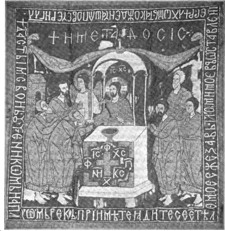 Известно, что воздухом – άήр, аёr в св. Литургии называется третий и верхний из трех покровов, которыми прикрываются святые дары; им прикрывается и диск и потир, наподобие воздуха, окружающего землю, как говорить Герман, патриарх Константинопольский в своей θеορіи, вспоминая темную ночь, покрывшую землю или в день предания Христа или Успения Богочеловека. Но так как тот же писатель и другие тексты называют воздухом завесу – καταπέτασμα ἤγουν ὁ Ἀήρ, «подобную тому камню, которым, подкатив его, прикрыл Иосиф вход в пещеру, и который запечатала стража Пилата», то, очевидно, именем «воздуха» назывались в древнейшую эпоху тонкие полотняные, просвечивающие завесы, затем церковные из тончайшего полотна, и только позднее это имя усвоено было покрову139, наиболее видному в литургических обрядах. В самом деле, мы встречаем в описи афонского монастыря Ксилурга от 1142 г. для других покровов: дискоса, потира или общее название καλύμμα – покров, или то же, но в форме δισκοκάλυμμα и ποτηροκάλυμμα. Самое символическое возношение и веяние «воздухом» над Дарами во время чтения Символа также могло подать повод к этому наименованию. Но тексты, собранные Дюканжем, удостоверяют, что название воздуха для общего покрова св. Даров долго считалось условным и сопровождалось словом: так называемый ό λεγόμενος άήр. Такого же происхождения и позднейший Аиръ,– шапка византийского Деспота, упоминаемая у Кодина в его соч. «о чинах» в гл. 3-й. У новейших греков воздух стал называться также νεφέλη по известному библейскому образцу покрывающего святыню «облака». Но, вместе с тем, у церковных писателей этот покров называется и платом, плащаницею чистою, которою Иосиф обвил тело Иисусово для погребения. Так, Симеон Солуньский в своей книге о Храме, гл. 64, выражается так: «иерей полагает (на трапезу) воздух, означающий и твердь, со звездами, и плащаницу: ибо им часто объемлется тело и кровь Иисуса, умершего и мирами умащенного, почему воздух и называется надгробием (επιτάφιον). Что в первое время самая плащаница имела размеры сравнительно небольшие, наподобие воздуха, видно также из другого текста Симеона о «великом входе» св. Литургии на Пасху: καὶ ἐπὶ κεφαλῆς τὸ ἱερὸν ἐπέχοντρας ἔπιπλον, ὁ γυμνὸν καὶ νεκρὸν εἰκονισμὸν τοῦ Ἰησοῦ: Плащаница названа здесь ἔπιπλον – общим именем церковной завесы, подвесной пелены, что то же – «воздуха», и если ее можно было нести на голове, то она не могла иметь современных размеров, около сажени, и изображение Христа – было на ней, очевидно, не в натуральный рост. Приблизительно этот размер сохранен в плащанице – воздухе (так названа она в русской подписи) Быстрицкого монастыря 1601 г., вкладе боярина Безобразова.