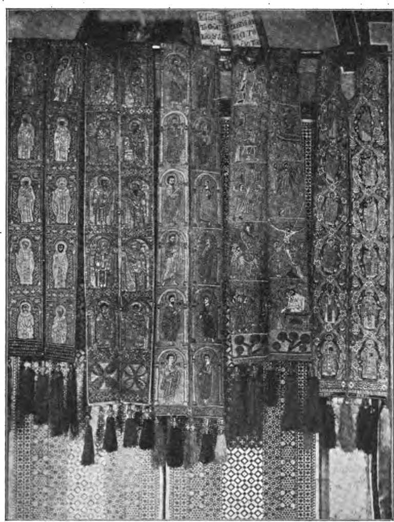 В обители Хиландарской хранятся две великолепные катапетасмы или завесы сербская и русская, первая XIV века, вторая XVI столетия, обе одинаково достойны быть представителями этого, некогда значительного рода церковной утвари, но со времени введения сплошных иконостасов и высоких царских дверей, утратившего фигурные украшения и, вместе с ними, свое прежнее значение. Тем более можно пожалеть, что монастырские нужды и монашеское равнодушие допускают тление н разрушение драгоценных покровов в сырой, неотапливаемой и полной вековой пыли ризнице, более напоминающей сарай и ныне служащей также библиотекою. Уже и теперь каждое развертывание скрученных, за неимением места, в трубку, завес не обходится без разрушения истлевших частей, а скоро, быть может, и самая основа начнет распадаться. И так как сербская завеса, как то удостоверено еще памятью многих монахов, служила завесою на царских дверях собора, то мы и советовали вновь пристроить завесу к прежнему месту, в расчете, что она на царских дверях вернее сохранится.