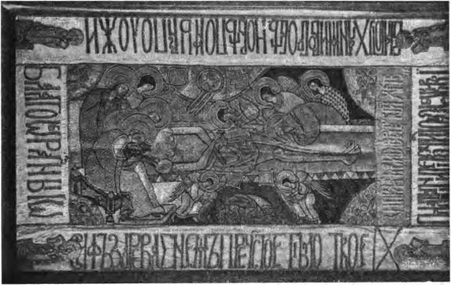 2. Следующий по времени памятник представляется плащаницею, молдовлахийского дела: это плащаница Букарештского музея, работы 1396 года, происходящая из монастыря Козиа в Румынии, шитая шелками, серебром и золотом по темно-лиловому (пурпурному) атласу. Находящаяся внизу широкая декоративная полоса показывает, что рисунок сцены «Положения во гроб» взят с иконы, продолговатой и узкой и не подходил к плащанице, которая должна была иметь отношение длины к ширине, как 20 к 16, т. е. служит украшением или покрышкою престола сверху (трапезофор) или с переднего фаса (индития). Известно, что вышивание церковных покровов долго было делом женского мастерства, которому нужно было брать рисунки в виде прорисей. В настоящем случае мы находим, поэтому грубую копию с великолепного произведения византийской живописи. Богоматерь обнимает Тело Христа, положенное на украшенном матрасе, охватив обеими руками за туловище и приподымая его к себе, а в ногах, преклонившись, рыдает Иоанн. Обе фигуры на заднем плане и потому не нарушают глубины религиозной мысли. Именно, вдоль одра Богочеловека стоят в торжественной позе служения четыре архангела в царственном орнате, держа рипиды (средние) и фенгии, т. е. факелы с чашками или с полулуниями под ними, какие употреблялись в византийских ночных процессиях150. Кроме греческой надписи: έπιταφίος θρῆνος наверху, вокруг по кайме славянская надпись, отвечающая литургическому назначению пелены: «да умлъчитъ всѣка плът земнаа и да стоит страхом и трепетом се бо царь царствующим и господь господствующимъ христосъ богъ нашъ приходит заклатися и дану быти въ пищу вѣрвыми предваряют его лици ангельстии съ вьсѣми начялы и власти многоочитаа херувими и шестокрылатаа серафими лица накрывающа и вьпиюща пѣснь: святъ святъ святъ. в лъто sца.