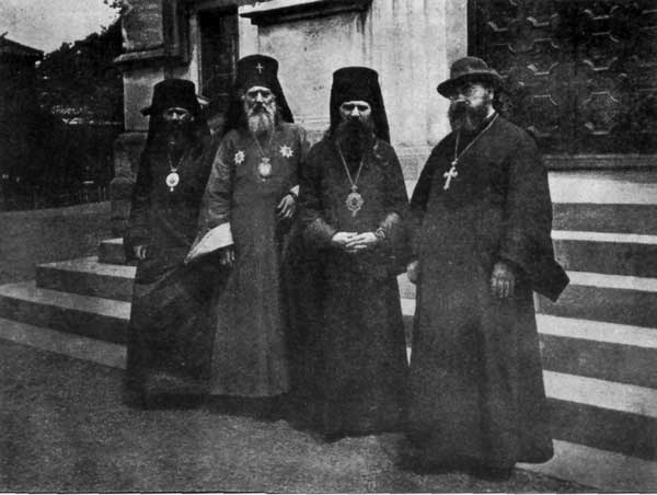 Святитель Николай на склоне лет, с гостями из России (около 1911 г.). Слева направо – епископ Иоанн, архиепископ Николай, епископ Сергий, протоиерей Острогов.