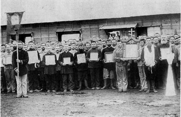 Ноябрь 1905 г., лагерь российских военнопленных в Нарасино. Молебен с крестным ходом перед возвращением на родину. Слева с крестом в руках – священник Иаков Тохэй