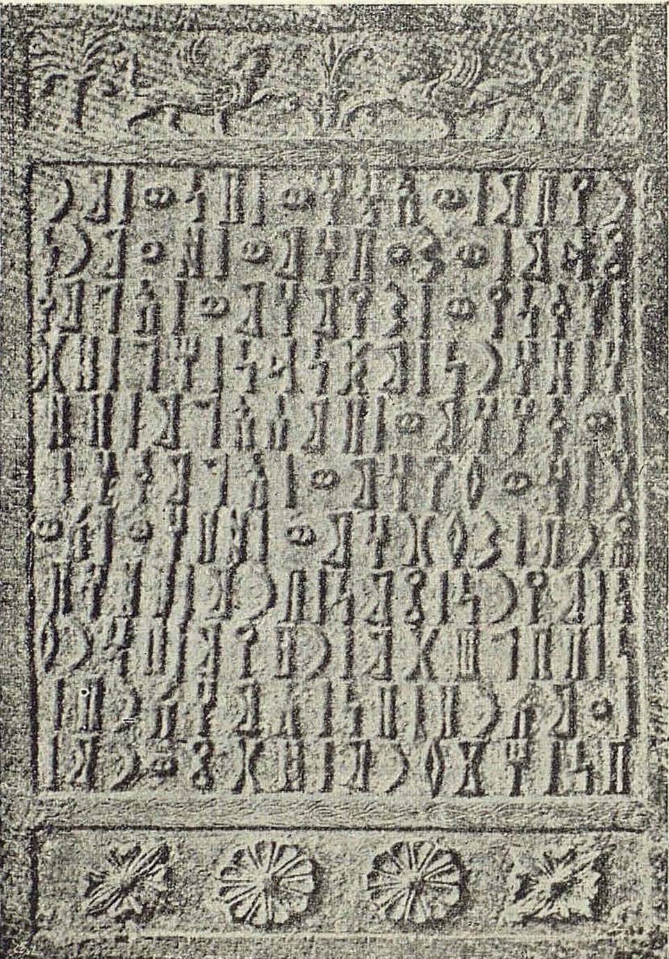 В южно-аравийских государствах, где арабы жили оседло, существовали некоторые производства из глины, дерева и металла; но те принадлежности их домашнего быта, которые отличались некоторым изяществом и роскошью, были обыкновенно иноземного происхождения. Древние писатели вообще свидетельствуют, что арабы, не только кочевые, но и оседлые, не стремились к развитию у себя ремесел и промыслов, а предпочитали доставать все необходимое в готовом виде, выменивая это на предметы туземного происхождения. Лучшим доказательством этого может служить посещение Соломона Савской царицей: она прибыла в Иерусалим с верблюдами, навьюченными благовониями и великим множеством золота и драгоценных камней, и когда увидала дворец Соломона, то сказала царю: «я не верила словам, пока не пришла сама и не увидали глаза мои; мне и половины не сказано, –мудрости и благ у тебя больше, нежели как я слышала (3Цар. 10:1–10; 2Пар. 9:1–9). Очевидно, царица Савская рассчитывала произвести на Соломона впечатление своим богатством, но была поражена царской обстановкой еврейского царя, какой южно-аравийская царица, довольствуясь естественными дарами своей страны, никогда не видела и не воображала. Что касается сабейской надписи на бронзовой плите, то по ней трудно судить о степени культуры Сабеев. Плита и надписи могли быть приготовлены в другой стране с более развитой техникой. (См. рисунок). Упоминаемый в надписи Альмак Хирранский, по нашей догадке, должен быть царь (Альмалик) Герраев, упоминаемых у Страбона. (См. выше. стр.). Если верно, что Герраи были выходцы из Халдеи, тогда относительно Сабейской надписи излишне говорить: она была привозная…