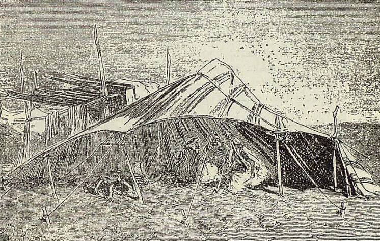 По описанию в «Сообщениях Императорского Православного Палестинского Общества252 сирийские и палестинские бедуины и в настоящее время живут в шерстяных палатках, материю для которых бедуинские женщины приготовляют сами из шерсти черных коз или овец. Палатки расставляются на открытых местах и поддерживаются внутри особыми шестами, а снаружи притягиваются веревками к колышкам, вбитым в землю. Палатки ставятся одна подле другой и образуют круг, внутрь которого на ночь загоняется скот. У главы рода (шейха) бывает всегда особая палатка, которая служит ему для приема гостей, что составляет с давних пор отличительно черту арабских нравов.
