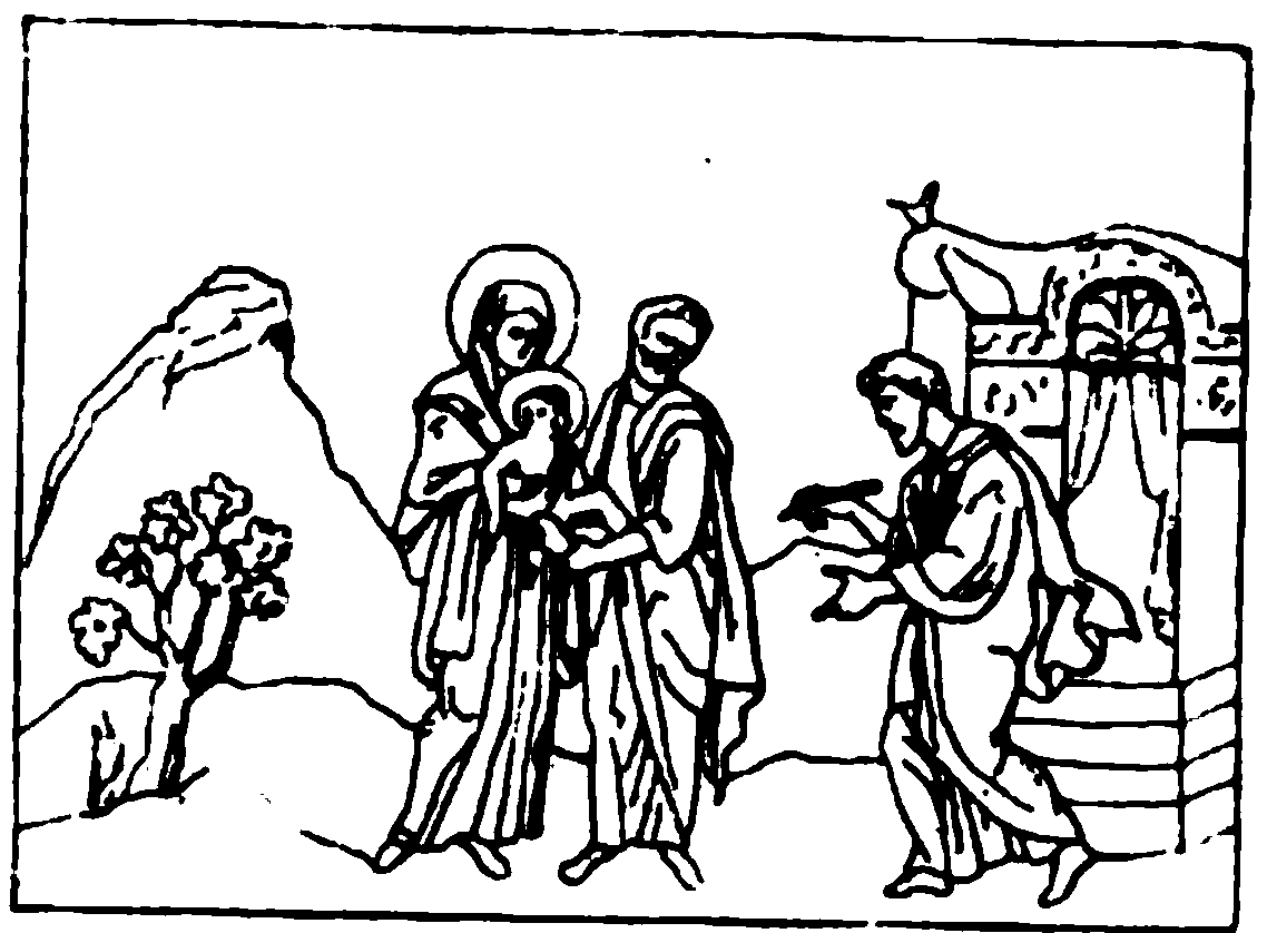 Греческий подлинник841 также мало уклоняется на этот раз от древнего предания: храм и купол (κουβοῦκλι), под которым стол и золотая кадильница. Св. Симеон Богоприимец принимает на свои руки Младенца Христа и благословляет Его. По другую сторону стола Пресв. Дева простирает к Нему руки; позади Нее Иосиф держит в своей одежде (ῤοῦχον842) двух голубей; возле него Анна-пророчица, указывающая на Христа; в свитке ее написано: «Сей Младенец сотворил небо и землю». Главную особенность композиции по подлиннику составляет благословение Младенца Симеоном, совершенно неуместное.