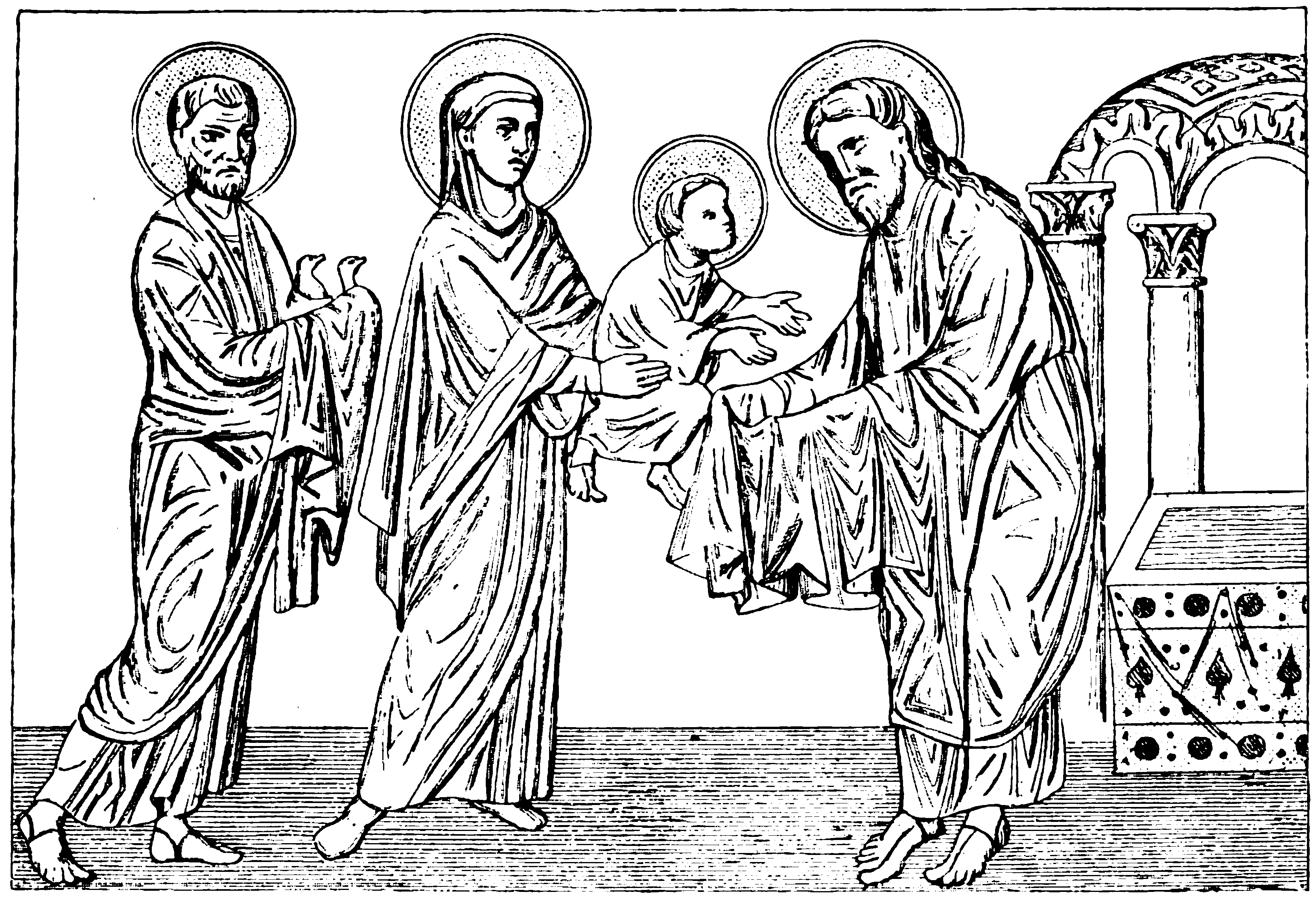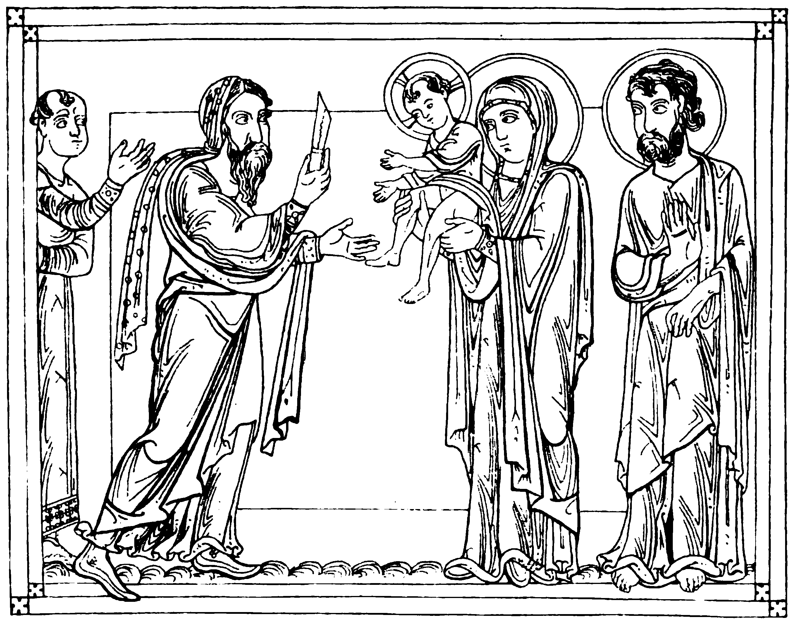 Пример последней в ватиканском минологии (под 2 Февраля834). Миниатюра минология исполнена Пантолеоном. Здесь тот же престол с киворием; старец Симеон в голубой тунике и желтоватом паллиуме наклоняется, чтобы принять от Богоматери в свои задрапированные руки Младенца. Богоматерь в синей тунике и лиловой верхней одежде держит на руках Младенца, одетого в золотую тунику; он испугался и простирает руки к Богоматери. За Богоматерью стоит Иосиф с двумя птичками; за Симеоном Анна в коричневой тунике и темно-зеленой одежде; правую руку она простирает вверх, что служит символом исповедания, в левой руке ее свиток – символ пророчества. Сходная композиция в минологии московской синодальной библ. (под 2 Февр., л. 8). Очень простые изображения сретения в лобковской (л. 164 об.) и барбериновой псалтирях (в конце при песни Симеона): палаты (лобк.), престол с киворием, увенчанным крестом (барбер.); Симеон намеревается принять от Богоматери на свои задрапированные руки Младенца; за Богоматерью стоит Иосиф. В лицевых Евангелиях: Афоноиверского монастыря № 1 (л. 264): престол; на верхней доске его изображен крест; над престолом киворий. Младенец, которого держит Богоматерь, простирает руки к Симеону. Позади Богоматери Иосиф с двумя птичками, за Симеоном праведная Анна с жестом исповедания и свернутым свитком. В парижском Евангелии № 74 (л. 109 об.835): престол и киворий с крестом; по левую сторону его Богоматерь с Младенцем на руках и за ней Иосиф с двумя птичками; по правую – Симеон в золотой одежде, в обычной позе, и за ним св. Анна со свернутым свитком. То же в елисаветградском Евангелии. В гелатском Евангелии836 престол или жертвенник с книгой и киворием; возле него Симеон держит на руках Младенца; позади него св. Анна; по другую сторону жертвенника Богоматерь, к которой простирает руку Младенец, и Иосиф.